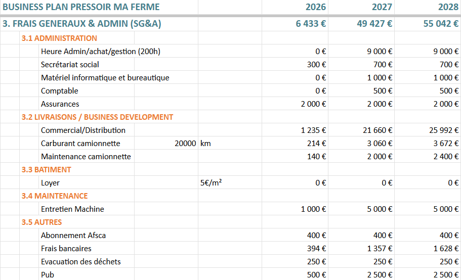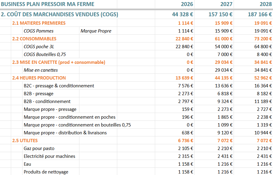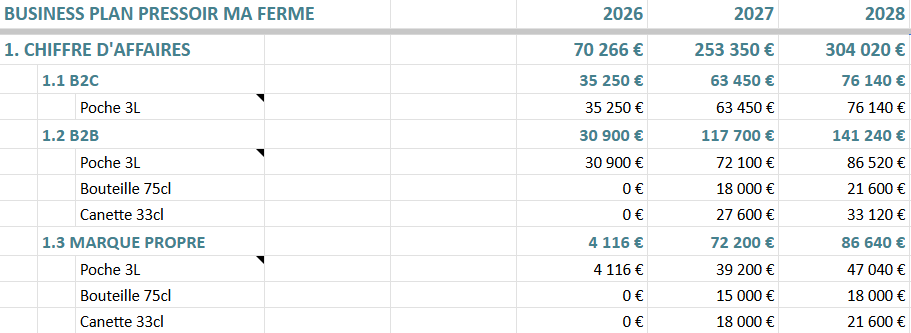 1. | Pressage Ă façon pour les coopĂ©rateurs (B2C) Volume prĂ©vu en 2027 : 45âŻ000 L. Pour rĂ©fĂ©rence: Tous les pressoirs professionnels font > 100.000 L/an. La rĂ©gion est en sous-capacitĂ© de pressage. La forte contribution Ă la vie, la visibilitĂ© et les ventes croisĂ©es Ă Ma Ferme n'est pas valorisĂ©e dans les chiffres. |