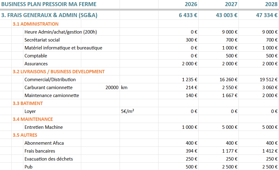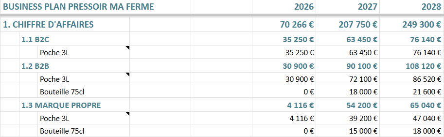 3. | Jus premium issus de fruits locaux Volume prĂ©vu en 2027 : 30âŻ000 L. Pour rĂ©fĂ©rence: Un des membres de l'Ă©quipe porteuse du projet a plusieurs annĂ©es d'expĂ©rience dans la commercialisation de jus pressĂ©. Ce volume correspond Ă 20% de son volume historique. |